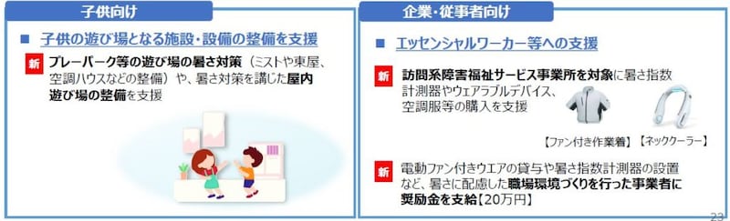 子ども向けにも、公園やプレーパークといった遊び場への厚さ対策、また屋内遊び場の整備支援を行うほか、事業者・従事者にも暑さ指数計測器やウェアラブルデバイス、ファン付き作業着などの導入支援を行います。