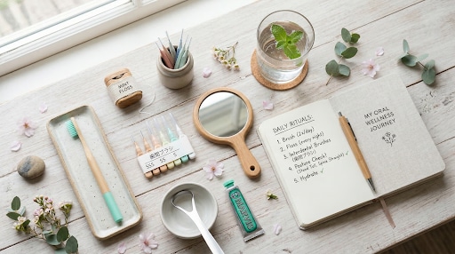 歯みがきに加えてフロスや歯間ブラシで歯と歯の間もケアすること。片側だけで噛む癖、無意識の食いしばりに気づくこと。安静時に上下の歯を接触させない意識を持つこと。頬杖・うつぶせ寝など姿勢の癖を見直すこと。そして鼻呼吸を意識することも口元の健康に直結する。