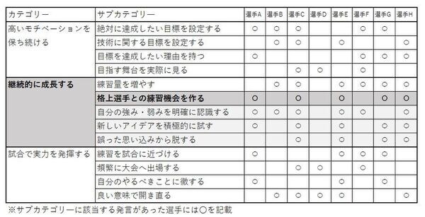 その結果、多くの選手が共通してブレークスルーのために重要だと感じている事柄が浮かび上がってきました。まず欠かせないのは、練習の質を高め、競技力を継続的に高めていくことです。それに加え、日々の練習に打ち込むための土台となる、高いモチベーションを保ち続けること、身につけた実力を試合で発揮できるようになることも重要です。インタビューを通して、これらを実現するために選手が行なっている具体的な工夫や実践も明らかになりました。