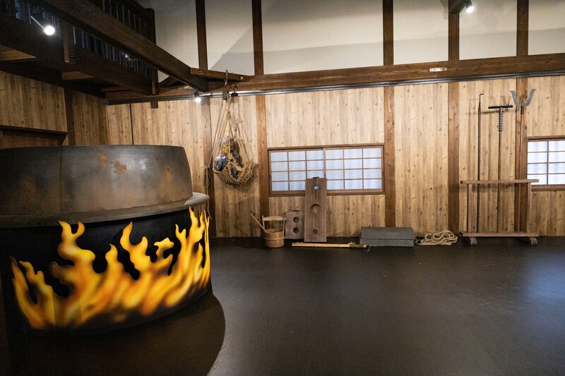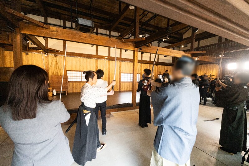 「修練道場」では侍の心得を学びます。入門生になった気分で刀を手にすれば、気分はすっかり江戸の侍!? 所要時間は約15分で、来場者は道場の弟子として刀の振り方や礼の方法などを学べるほか、立ち回りの演舞も間近に見ることができます。