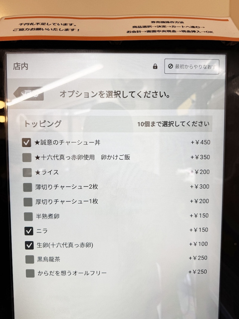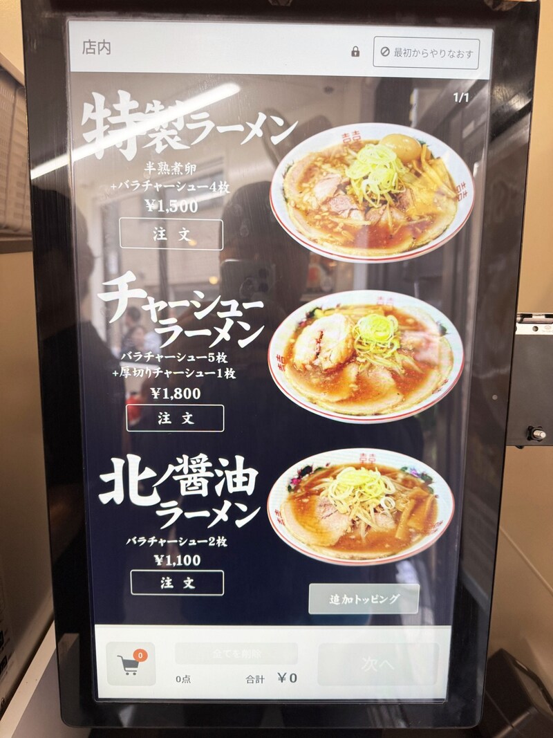 ちなみにラーメンの種類は特製ラーメン、チャーシューラーメン、北ノ醤油ラーメン。サイドメニューは誠意のチャーシュー丼、十六代真っ赤卵使用卵かけご飯、ライス。トッピングは薄切りチャーシュー、厚切りチャーシュー、半熟煮卵、ニラ、十六代真っ赤卵生卵。ドリンクは黒烏龍茶、からだを想うオールフリーが用意されている。