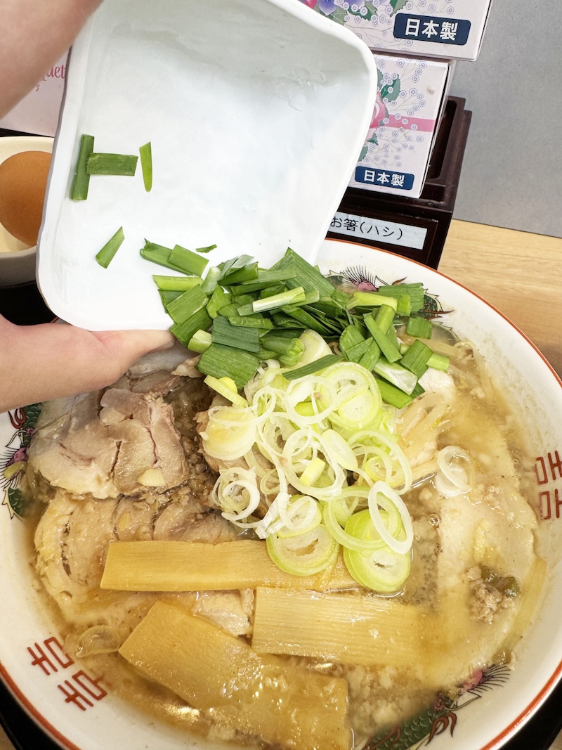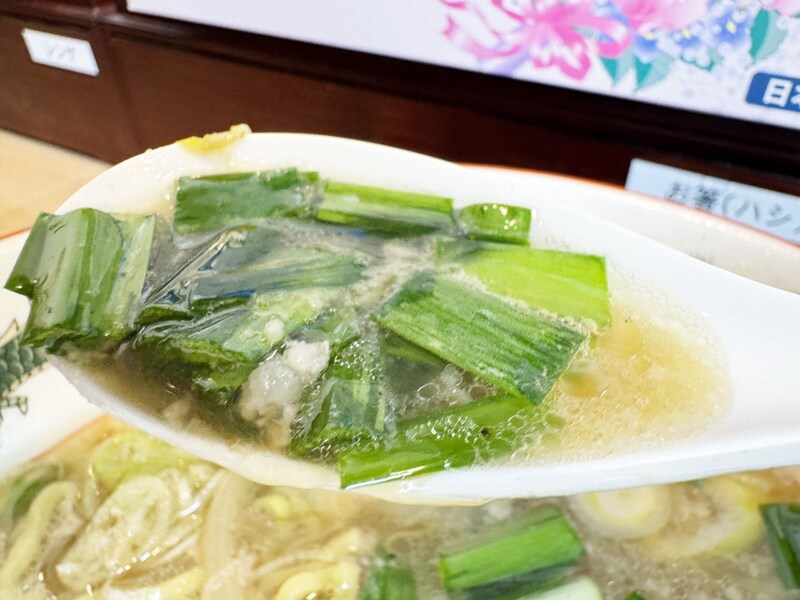 ラーメンのスープとニラの相性はバツグン。ニラをしっかりとスープに浸して、レンゲですくいとり、スープとともに食べる。これがもう最高オブ最高。シャクッ! ジャクッ! ハフムシャッ! この心地よい食感と共にあふれるニラ特有の薫り、そんなニラと融合したスープの旨味は神、いわゆるゴッド。