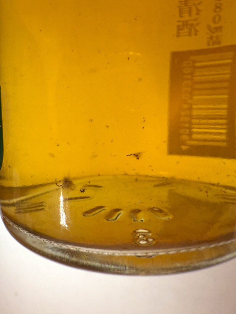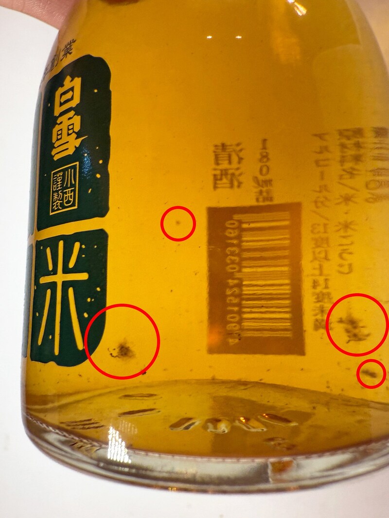 タンポポの綿毛のような、ほこりのような、謎の物体がいくつか酒の中でプカプカと浮かんでいます。ニオイをチェックするまで完全に未開封だったし、何かが混入することも考えにくい状況。これきっと、カビ的なやつだろ……!!