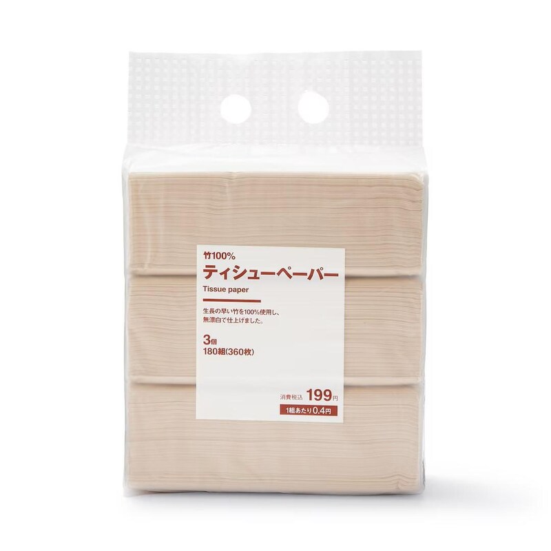 生長の早い竹100%で作られた、温もりを感じるティシュー。3個セット・180組(360枚)入りなので、生活の中で気兼ねなく使えます。