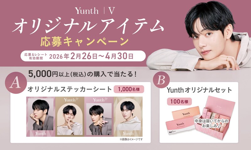 現在「Yunth」では、対象商品を5,000円(税込)以上購入すると、BTS・Vさんの「オリジナルステッカーシート」や「Yunth オリジナルセット」が当たるキャンペーンも開催中! 5,000円ごとに1回応募が可能で、回数制限なく参加できるので、ファンの方はこちらも見逃せません♡ キャンペーンは4月30日(木)まで行われているので、ポップアップストアでのお買い物とあわせて、ぜひ応募してみてはいかがでしょうか 。
