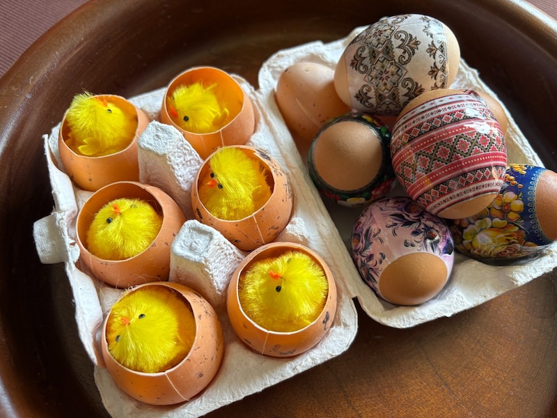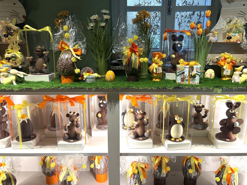 ディスプレイのモチーフには「新しい命の象徴」として、卵やヒヨコがよく使われ、繁殖力が強いウサギも生命力の象徴としてパスクアを彩っています。