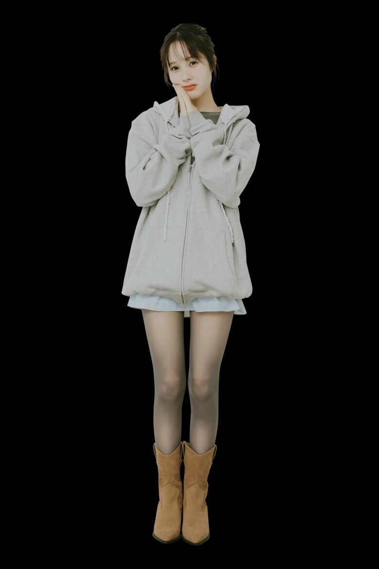 フーディ単体だと、カジュアルな印象になりがち…。バラクラバをフード風に重ねてWフードにしてみると、甘さがプラスされて◎。