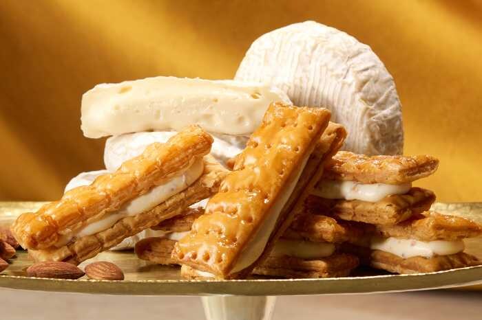 黄金色のパイ生地に、カマンベールの風味豊かなクリームとアーモンドダイスを重ねた「ミルフィユ〔カマンベール&アーモンド〕」。