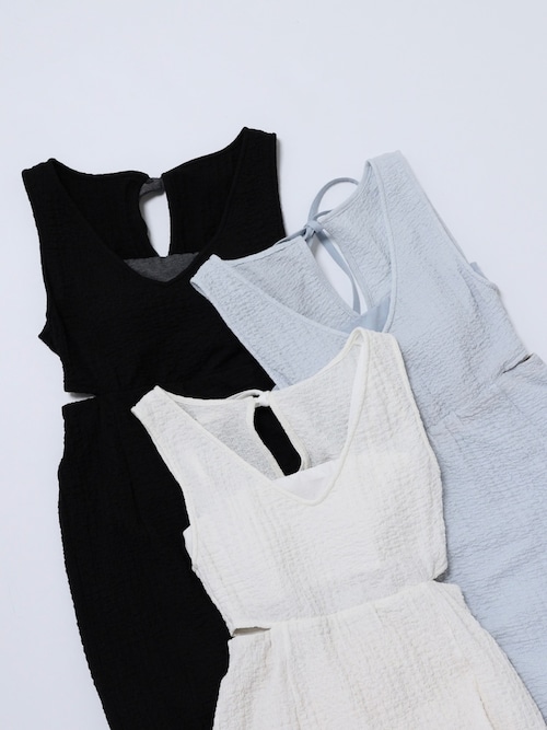 さりげないサイドカットアウトデザインで、ヘルシーな肌見せに。後ろには同配色のリボンをあしらいバックスタイルまで抜かりなく。