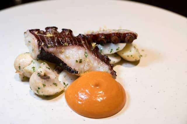 ▲冷たいアペタイザー「炙り真蛸と新じゃがいも 長期熟成味噌 “ひかり味噌” と赤パプリカのソース」