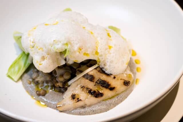 茄子をピューレ状にした中東の前菜料理 “ババガナッシュ” をお皿に敷き、柔らかな赤茄子を使用。レンズ豆のツルリとした食感とほのかな甘味を加えたサラダ仕立ての料理です。鶏肉を思わせるソイミートは、グリルした焦げ目の香ばしさがアクセント。豆乳フォームで作られたエスプーマ(泡)がかかり、ヴィーガンの方でも楽しめます。