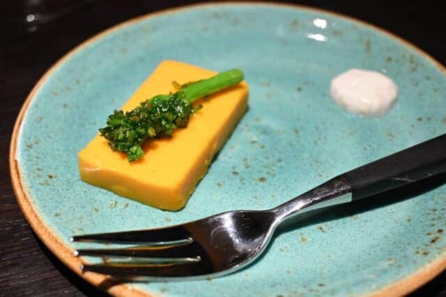 最初のひと口料理は、菜の花を添えたムース。鮮やかなオレンジ色と濃い緑のコントラストが美しく、よく炒めた人参だけを使ったムースの甘味に、春の訪れを告げる菜の花の苦味が寄り添います。シンプルながらも意外性のあるアミューズは、続く料理に期待がふくらむコース料理の始まりでした。