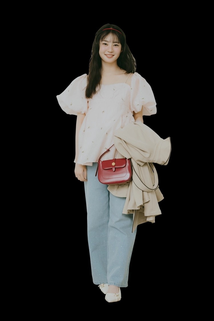 パフスリーブトップスは着回し。トレンチコート 29,700円/リランドチュール スカート(ジップブラウスとスカートのセット)16,940円/REDYAZEL ルミネエスト新宿店 スエードバッグ 3,690円/神戸レタス バレエシューズ 11,900円/NADIA FLORES EN EL CORAZON