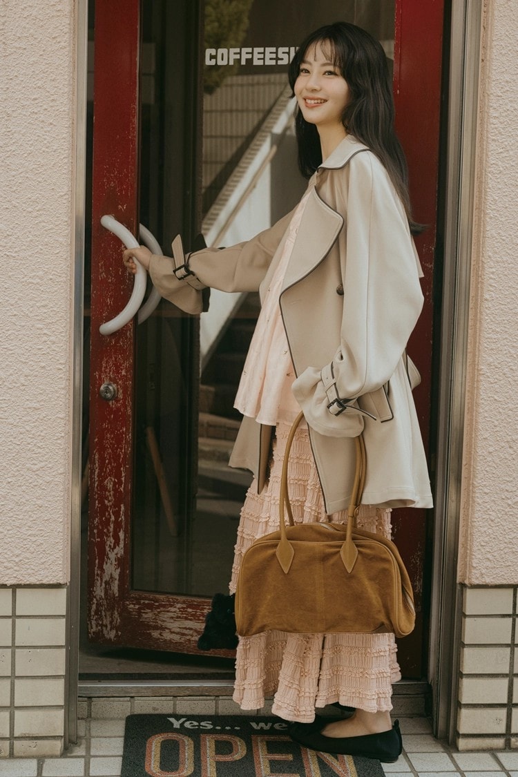 春の定番トレンチコートとあわせた万人ウケを狙う◎。小物は落ち着いた色味を選んで上品にまとまった、オトナフェミニンコーデ。
