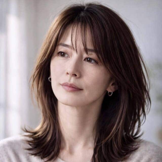 前髪を作ると顔の印象をやわらかく見せやすいでしょう。額の見える範囲が分割されることで、視線が自然と目元に集まり、表情全体が穏やかに映ります。