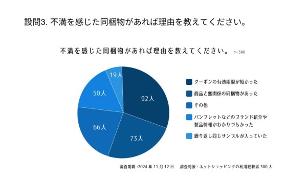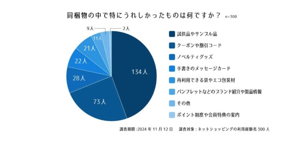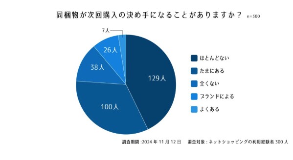 2026年3月30日 【お客様アンケート】ネットショップの同梱物についての実態調査 ヘイグ 以下、メーカー様より頂いたリリース文を掲載しております。 販売代行サービス「売る倉庫」を提供する醍醐倉庫株式会社(本社:東京都大田区)は、同梱物についてのアンケート結果を公開しました。同梱物は企業やブランド情報の提供や次回の購入を促進するためのツールとして重要な役割を果たしています。本調査では、消費者のニーズや不満、同梱物が企業やブランドにどのような印象を与えるかなどを実態調査し、分析しました。調査期間2024年11月12日調査対象20~60代以上のネットショッピングの利用経験者男女300人(女性170人、男性130人)設問1. 最近購入した商品には、どのような同梱物が入っていましたか?設問2. 同梱物の中で特にうれしかったものは何ですか?設問3. 不満を感じた同梱物があれば理由を教えてください。設問4. 同梱物が次回購入の決め手になることがありますか?配信元企業:醍醐倉庫株式会社