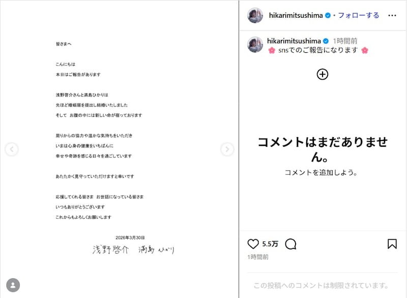 満島は浅野と連名での文書を投稿し、「本日はご報告があります 浅野啓介さんと満島ひかりは先ほど婚姻届を提出し結婚いたしました」と報告。さらに「お腹の中には新しい命が宿っております」と明かした。続けて「周りからの温かさや温かな気持ちをいただき、いまは心身の健康をいちばんに、幸せや希望を胸に日々を過ごしています。あたたかく見守っていただけますと幸いです」と呼びかけ、「応援してくれる皆さま お世話になっている皆さま いつもありがとうございます これからもよろしくお願いします」と感謝をつづった。