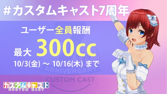 配布アイテム【7周年スタンプ】を使用した画像を作成し、ハッシュタグ「#カスタムキャスト7周年」を付けてX(旧Twitter)に投稿すると、集計期間中の投稿件数に応じて、国内全ユーザーに最大300キャストコインをプレゼントします。