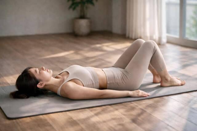 仰向けになり、両ひざを軽く曲げて足を床につけます。両腕は体の横に自然に置き、手のひらは床へ。腰が反らないようにお腹に軽く力を入れ、背中を安定させます。