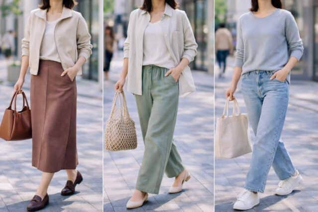 さらに、ベージュやグレーだけでまとめるのではなく、赤みブラウンやセージグリーン、ブルーグレーのようなやわらかな色をさりげなく取り入れると、“無難”で終わらない春らしい着こなしに整います。