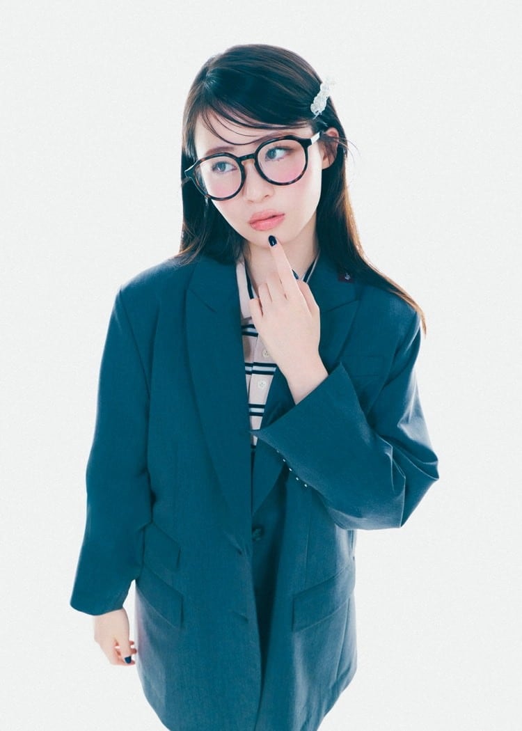 ボストンフレーム×太縁は中顔面縮小効果を狙える最強な組みあわせ。ジャケットあわせで、とことんプレッピーなスタイルが正解♡