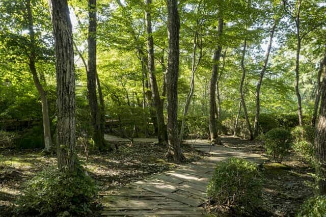 本館・別館の宿泊棟は森の中に点在していて、レストランや大浴場など、どこへ行くにも豊かに茂る木々の間を抜けて向かいます。