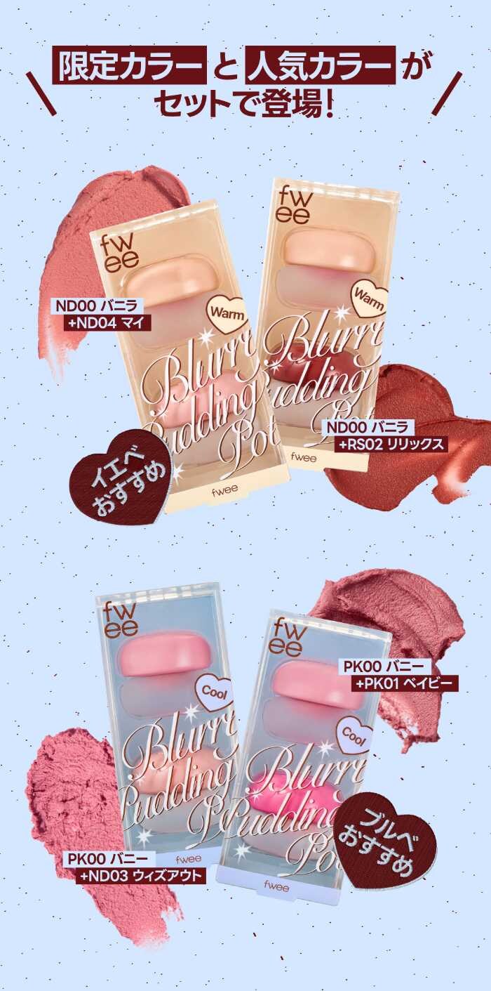 韓国コスメ好きの間で話題の「fwee(フィー)」から、待望の新色が日本上陸♡大人気の「リップアンドチークブラーリープリンポット」に、韓国限定カラー“バニー”と“バニラ”が加わり、特別なセットとして登場します。ふわっとぼかすような質感と旬のカラーで、春メイクをぐっとアップデート♪数量限定の特別企画は見逃せません。