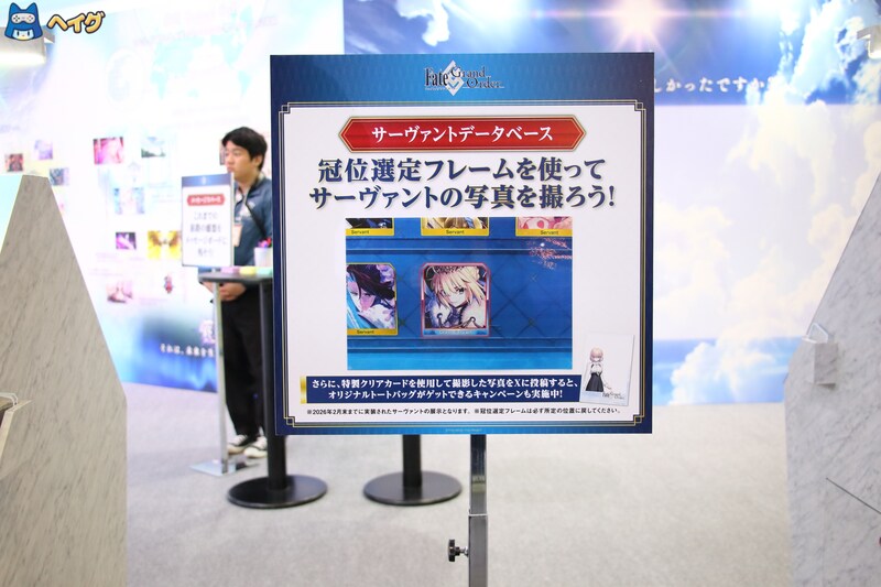 ブース内には、シリーズの原点である7クラスのモニュメント、宝具「希望築く人理の盾(ロード・カルデアス)」、終章までの物語を振り返る特製パネル、好きなサーヴァントを召喚して一緒に記念撮影ができる「英霊召喚フォトスタジオ」、そして冠位制定フレームを使って好きなサーヴァントの写真が撮れる「サーヴァントデータベース」がありました。