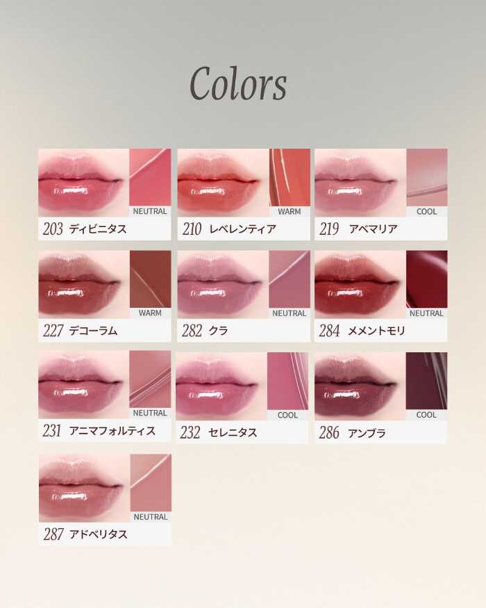 重ねるほどに透明感のある輝きが増し、ムラなく美しい発色を実現します。軽やかなテクスチャーで唇にフィットし、しっとりとした仕上がりが続くのも魅力です。