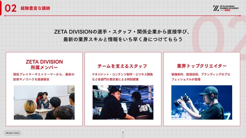 この課題に対し、新校ではZETA DIVISIONが培ってきた競技実績やマーケティングの知見をカリキュラムに凝縮。現場の第一線で活動するスタッフが直接指導にあたり、実際のイベント現場での実習や、スポンサー開拓をシミュレーションするプロジェクトなど、徹底した「実践主義」を打ち出します。