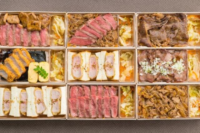 「勝福惣店」の看板メニューは、⽇本の伝統技法である昆布〆で熟成させたビフテキ重。ほかにもカツサンドなど、⾒た⽬も味も楽しめる商品がそろいます。