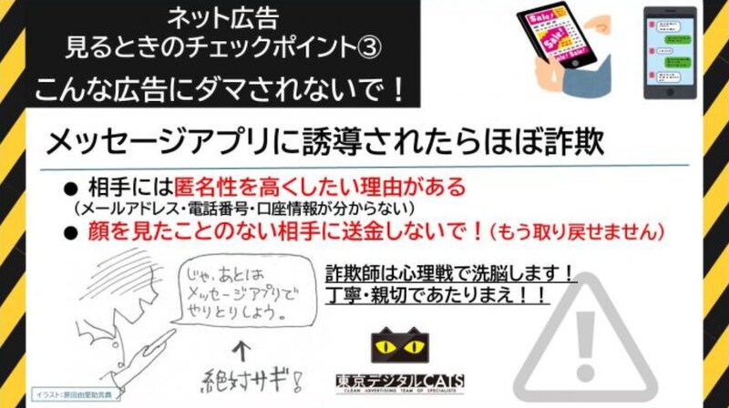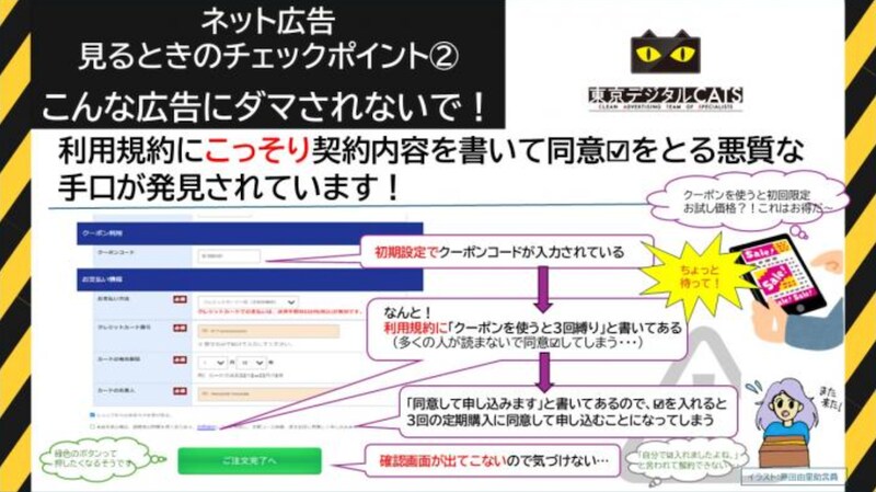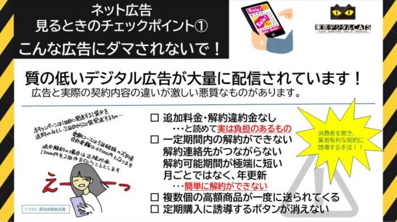 東京都生活文化局消費生活部では「悪質な不当広告への注意喚起」を行っており、急増するデジタル広告の不当表示に対応するため、令和5年に専門家助言員チーム「東京デジタルCATS」を立ち上げました。