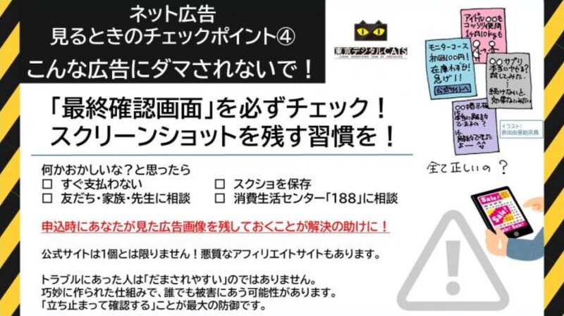 デジタル広告によるトラブルを防ぐため、契約条件を冷静に確認することや、重要な契約条件がこっそり書かれていないかを警戒すること、メッセージアプリに誘導された時点で警戒すること、申込み前に最終確認画面を必ずチェックし、スクリーンショットなどを残すことが大切だと発信しています。