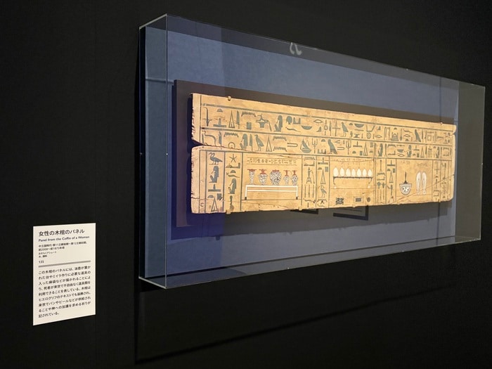 ミイラ作りには、沢山の品物を用いて作られています。「女性の木のパネル」死者が来世で不自由なく道具類を用いられるよう、油壺が置かれた台、ミイラ作りに必要な道具の入った麻袋などが描かれております。