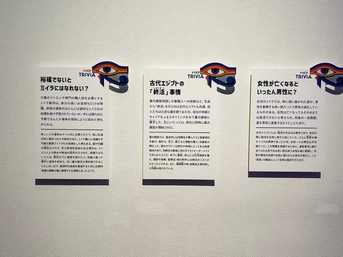 会場の壁には、わかりやすい”トリビア”が貼られており、エジプトの不思議や疑問についての解説が書かれています。なるほど〜!と楽しみながら拝見しました。