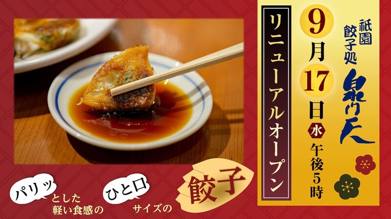 祇園・花見小路に店を構える餃子処「泉門天 京都祇園本店」が2025年9月17日(水)にリニューアルオープン。パリッとした軽い食感にひと口サイズのぎょうざは、生にんにくを使用せずガーリックパウダーで風味付けした上品な味わいが特徴。京都府特産の銘柄豚「京都ぽーく」を使用し、肉より野菜多めのこだわりの比率で、コクがあるのにあっさりとしていくつでも食べられる味に仕上がっています。