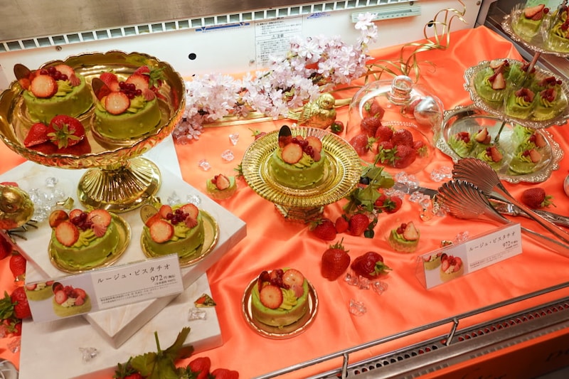 阪急うめだ本店限定「ルージュ・ピスタチオ」を、4月1日(水)から期間限定で販売。ピスタチオ風味の生地とクリームを、刻んだピスタチオ入りのチョコレートでコーティング。甘酸っぱいいちごといちごのガナッシュを飾った華やかなケーキです。