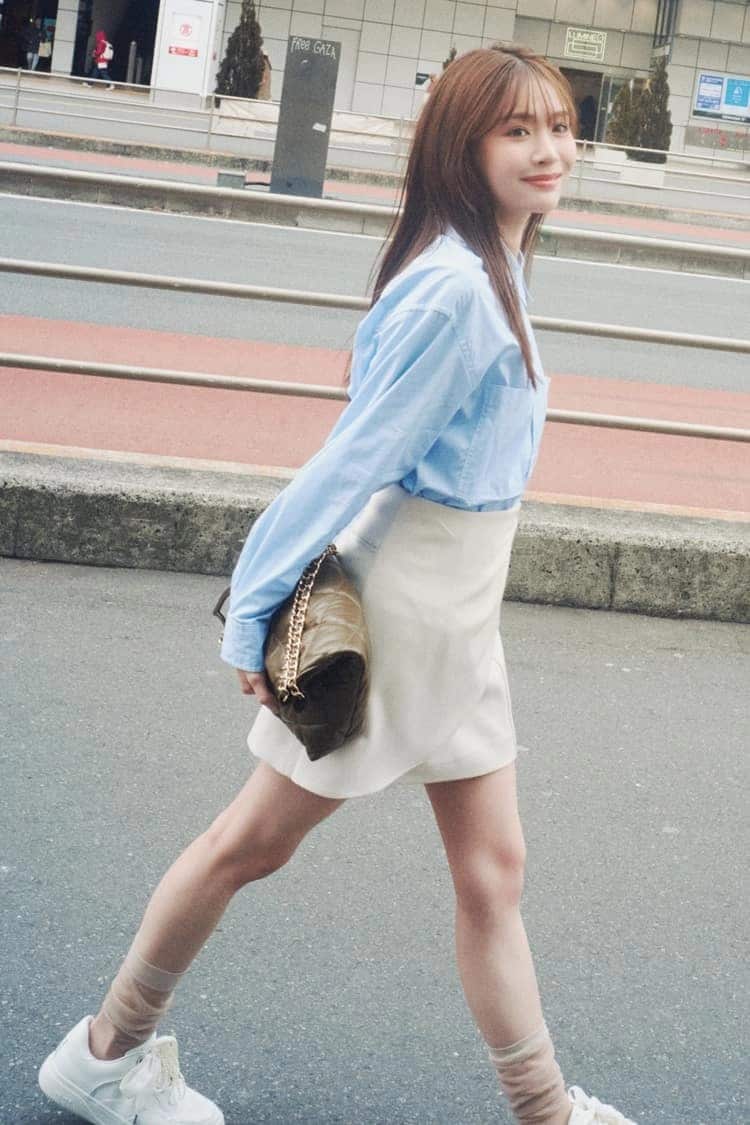 爽やかなブルーシャツにミニスカートをあわせて、軽やかで女のコらしい印象に。足元はスニーカーでカジュアルダウンして、頑張りすぎないキレイめコーデが完成。