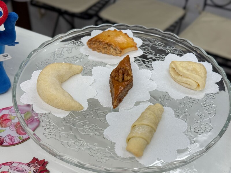 写真中央「パフラヴァ」、左から時計回りに「バナン」、「くるみ入りケテ」、「ガチョウの足」、「ムタキ」