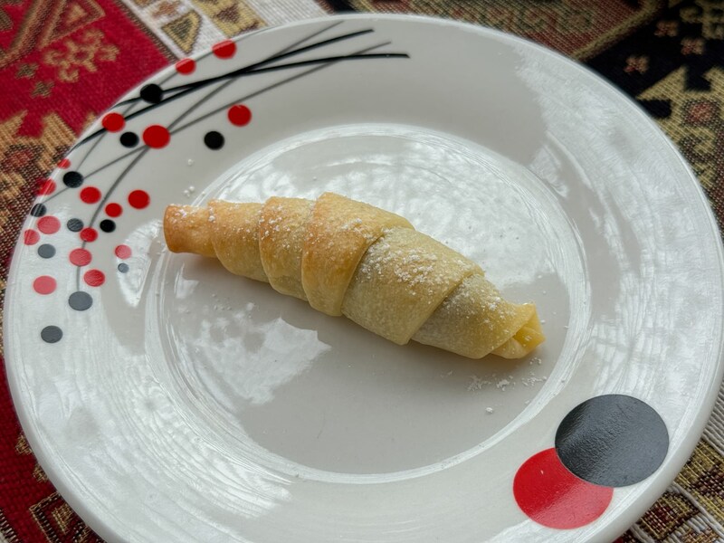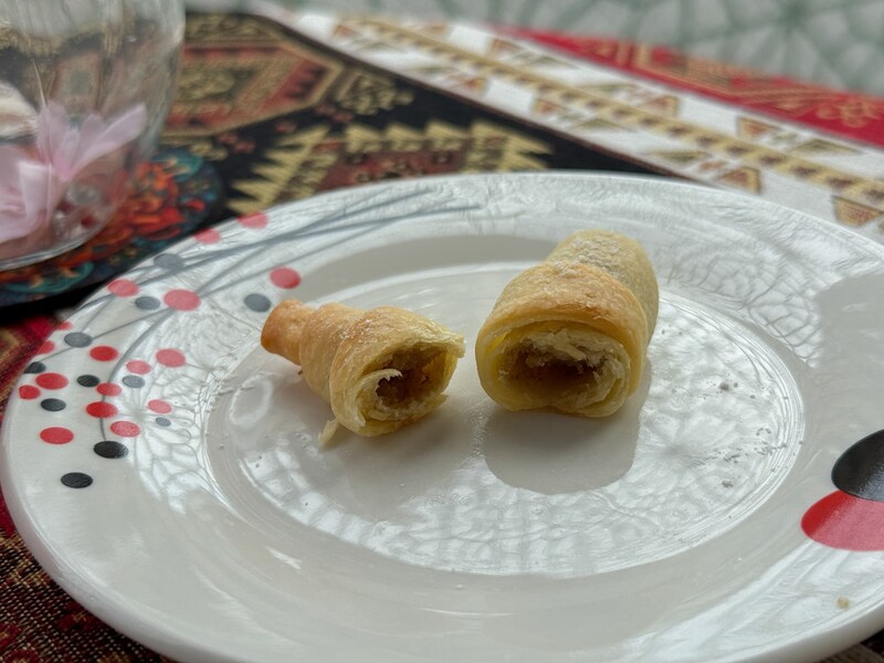 二つ目は、アゼルバイジャンの伝統スイーツ「ムタキ」。クロワッサンのような愛らしい見た目で、しっとりしたパイ生地の中には、ヘーゼルナッツとくるみのペーストがたっぷり。ひと口食べると、ナッツの香ばしさが広がり、紅茶との最高のペアリングを堪能できます。