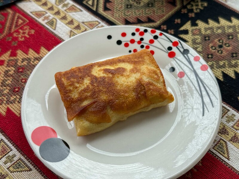 しっとりとしたクレープ生地の中には、お肉やたまご、玉ねぎなどを混ぜた具材がぎっしり。オリーブオイルで焼き上げられた素朴な味わいで、どこか懐かしさも感じられる一品です。