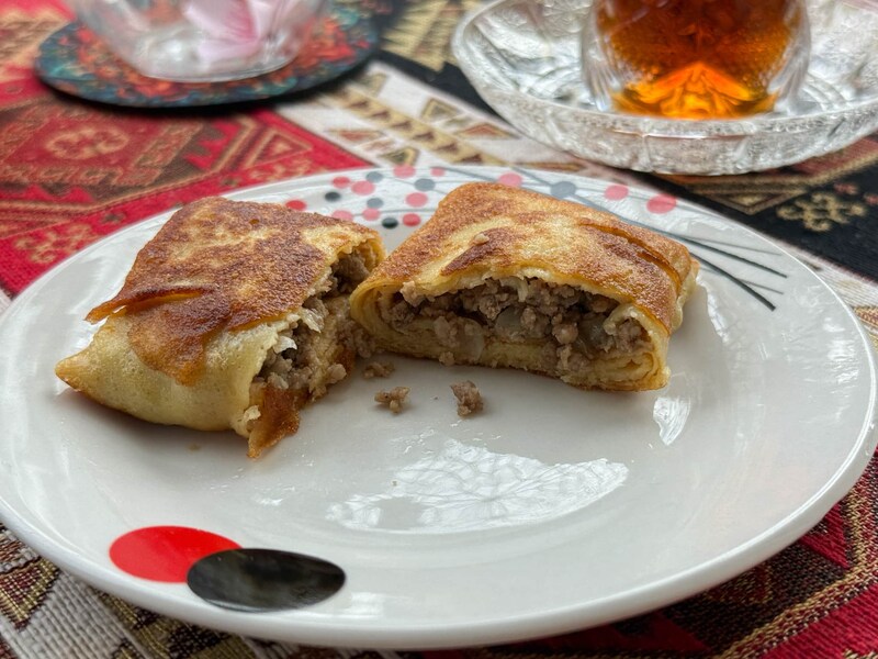 紅茶のお供にいただいたのは、金曜・日曜限定で販売されている、アゼルバイジャンの定番メニュー「ミートクレープ」。現地では“日本のおにぎり”のように親しまれている存在なのだそう。