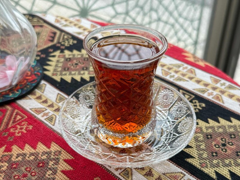 まずは美しいグラスに注がれた「ベルガモット」をひと口。洋梨のようにくびれたこのグラスは「アルムドゥ」と呼ばれるアゼルバイジャンの伝統的な茶器で、くびれているため熱い紅茶でも手が熱くならず、底が広いので冷めにくいという優れもの。