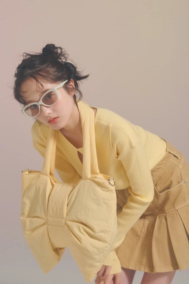 ニットトップス 15,400円/JOSE MOON(DOT ONE)リボンバッグ 3,299円/W♥C プリーツデニムスカート 12,100円/rienda(バロックジャパンリミテッド)サングラス 10,900円/チャールズ&キース(チャールズ&キース ジャパン)