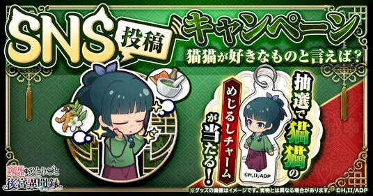 ミニキャラクターの公開に合わせて、各種公式SNSにて猫猫の限定グッズが当たるキャンペーンを開始しました。X・Instagram・LINE・DiscordのSNSから抽選に参加できますので、ぜひこの機会に公式SNSをご覧ください。