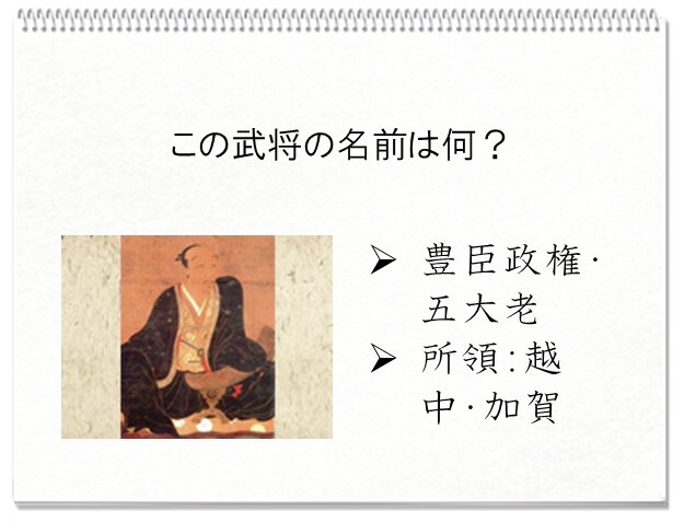 【答】 前田 利家(まえだ としいえ、1537~1599)◆主君:織田信長→秀信→豊臣秀吉→秀頼◆主な城:七尾城(能登)、金沢城(加賀)◆略歴・逸話:桶狭間の戦いでは出仕停止処分中だったにもかかわらず勝手に参戦。首級3つをあげるも功績を認めてもらえず、翌年の斎藤家との戦いでも首級2つをあげるなど武勇伝は数知れません。武勇一辺倒の人ではなく、計算に強く、前田家の財政を細かく管理していて、愛用の算盤があったともいわれています。