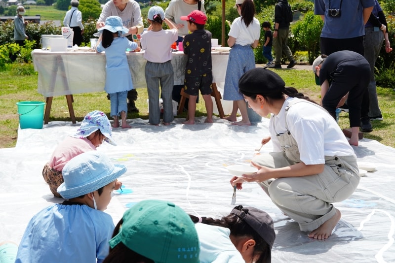 さらに、自然の中で大きな絵を描くワークショップや、こいのぼりに色を重ねる体験など、自分の手で何かを生み出す楽しさに触れられる機会も用意されています。花を摘んで持ち帰ることができるアクティビティもあり、目に映る景色だけでなく、その時間の記憶を形として持ち帰ることもできます。