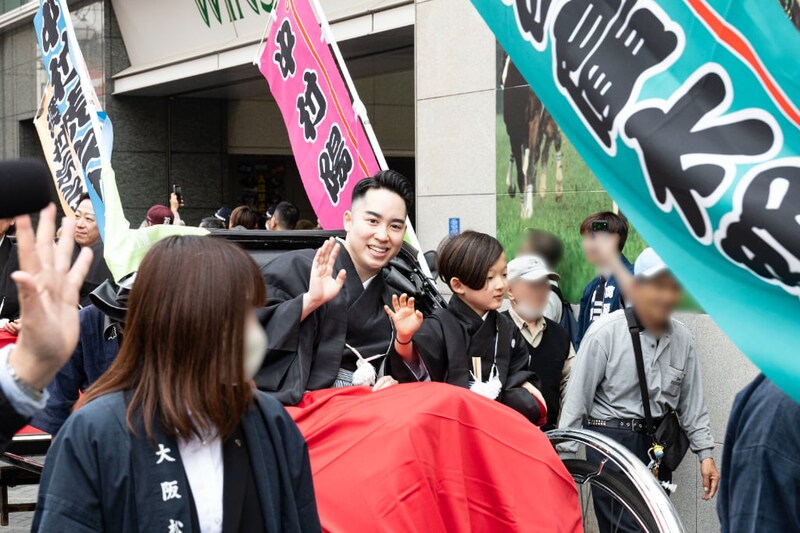 お練りを終えた役者たちは、大阪松竹座前に詰めかけた人混みに手を振りながら、一旦劇場へ入っていきました。