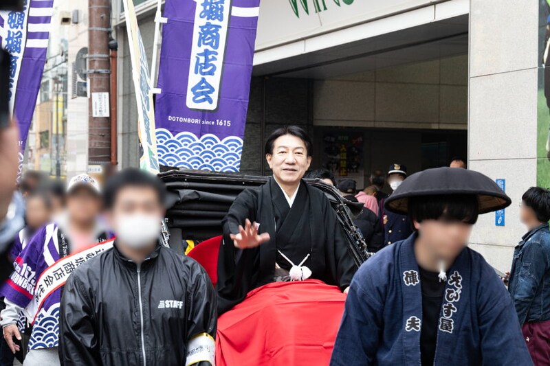 スタッフが持つ「大阪松竹座 御名残道頓堀お練り」の垂れ幕のあとから、お練りが続きます。
