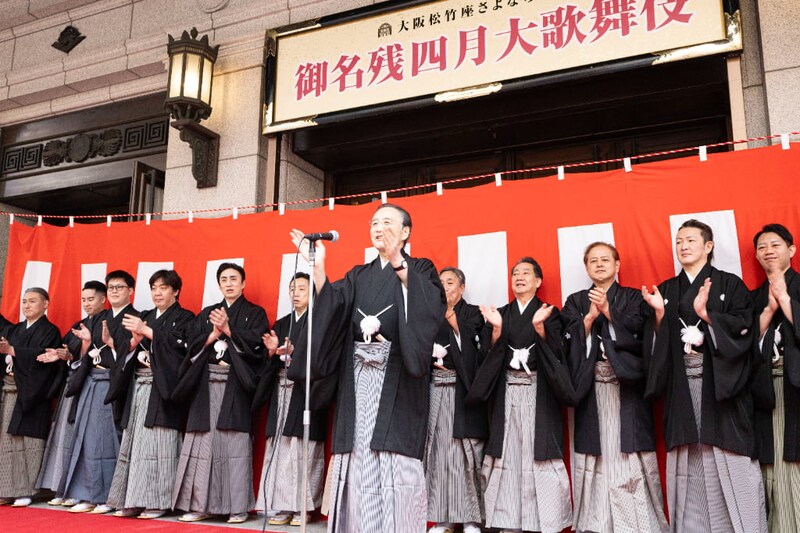 松竹株式会社 代表取締役会長 迫本淳一氏は詰めかけた人たちに御礼を伝えると、大阪松竹座の歴史について振り返り、改めて感謝を伝えます。この5月に一旦大阪松竹座が閉館になることを話し、最後の公演は豪華な顔ぶれであること、そしてこれまでの思い出を心に観劇を楽しんでいただければとアピール。そして、お練りでお客さまからのご声援を肌で感じられたと強調すると、それが心の支え、いい演劇を続けるための心の源泉となると力を込めました。
